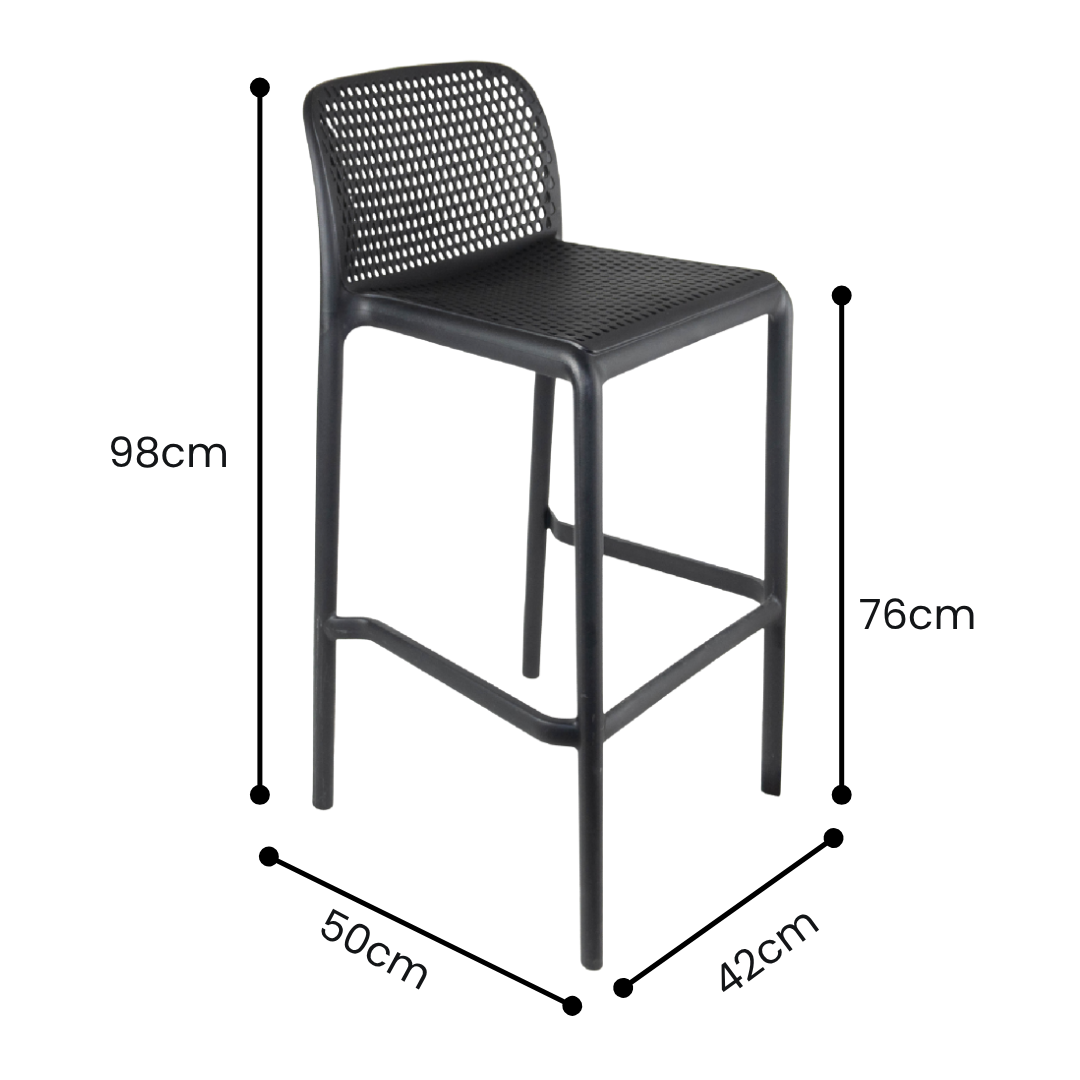 Su diseño con respaldo aporta mayor comodidad, mientras que la base extraíble permite ajustar el taburete a dos alturas según la necesidad del ambiente. Gracias a su resistencia al exterior y a su capacidad de carga, el Lecco se convierte en una solución confiable tanto para uso residencial como profesional.